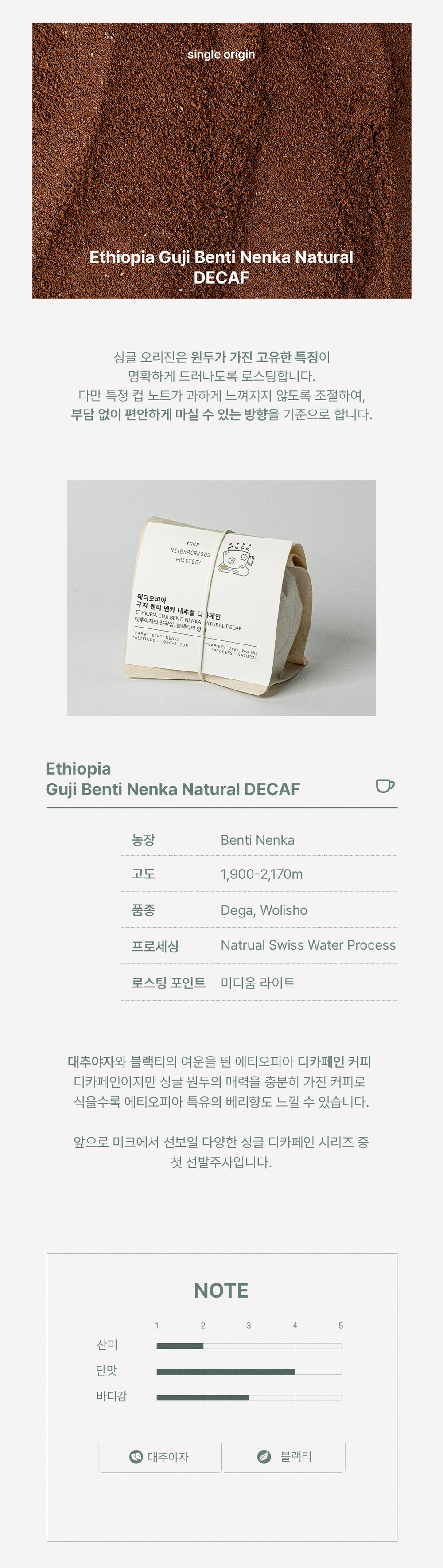 [싱글오리진] 에티오피아 구지 벤티 넨카 내추럴 디카페인 100g